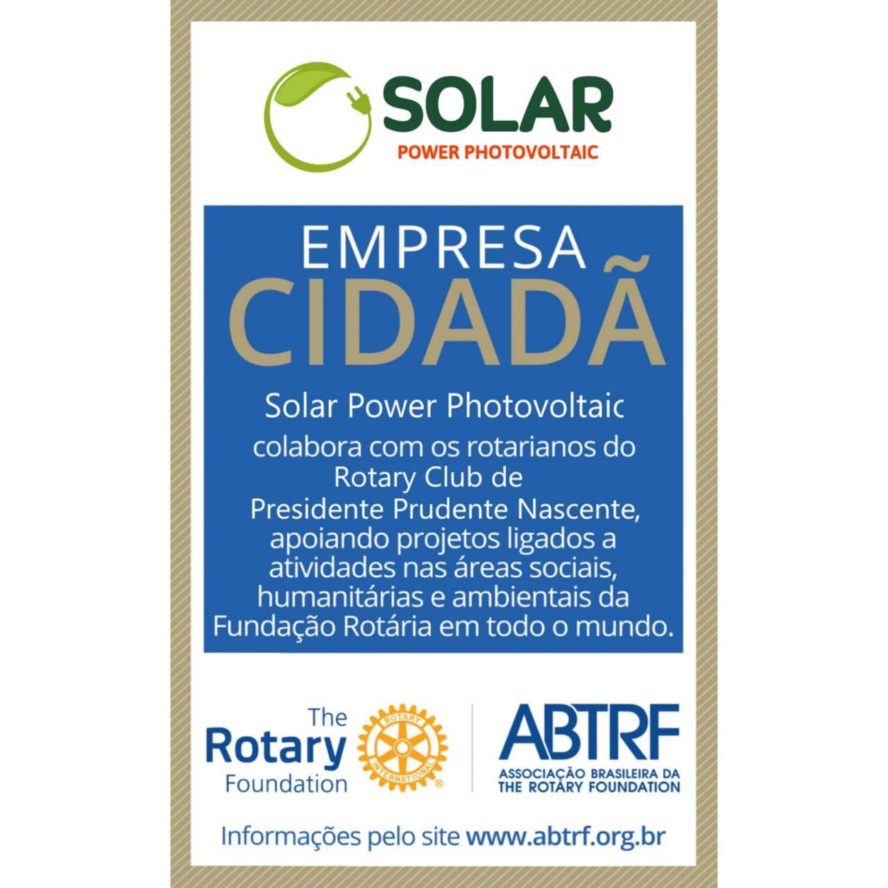A Solar Power Photovoltaic agora faz parte do Programa Empresa Cidadã do Rotary Club de Presidente Prudente Nascente, onde, a ABTRF através do programa Empresa Cidadã, atesta a responsabilidade social de sua empresa ao torná-la parceira do Rotary em sua obra reconhecida de transformar o Brasil.
