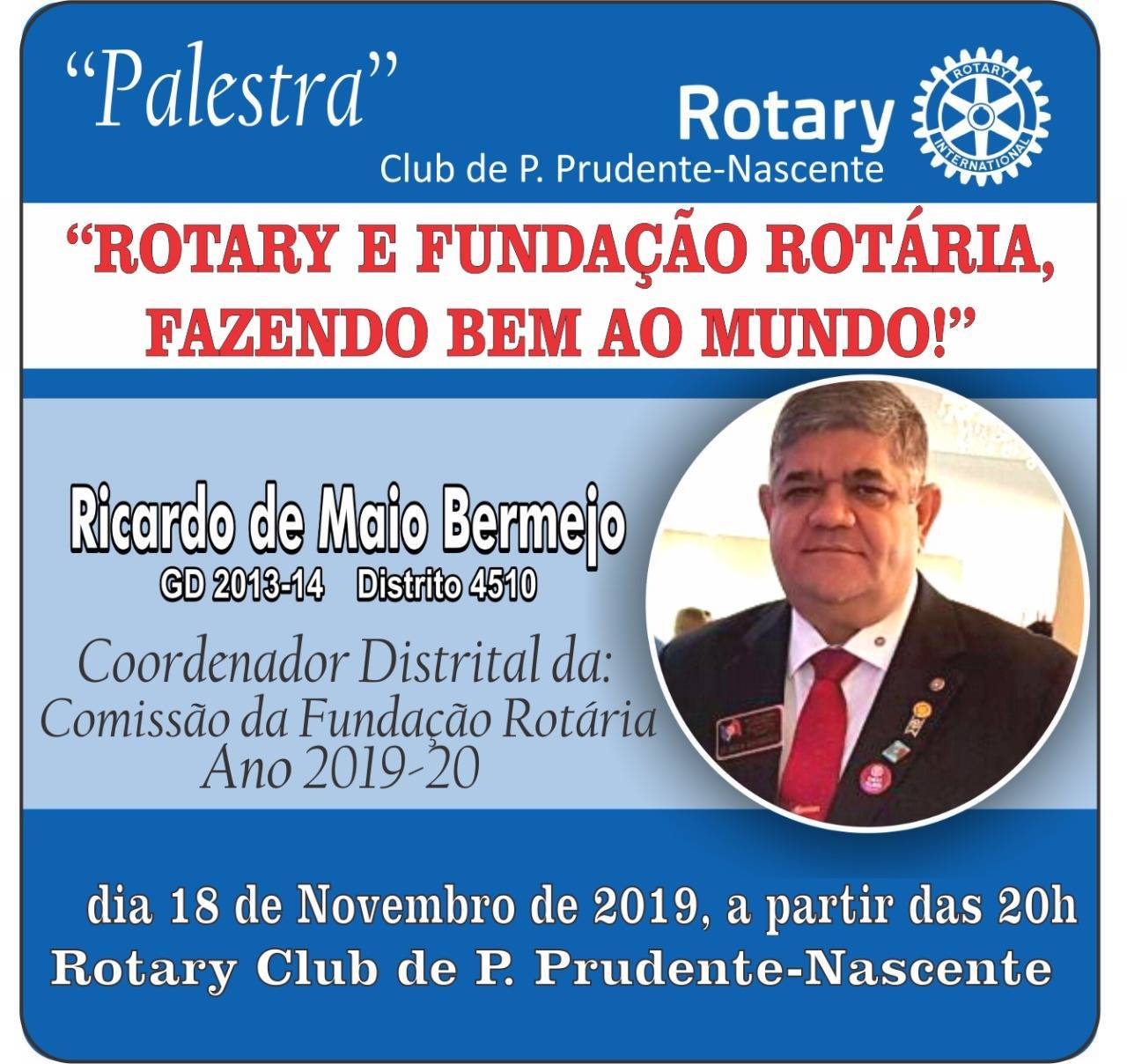 Em reunião de interclubes do Rotary Club de Presiddente Prudente-Nascente e Leste, realizaram no dia 18 de Novembro de 2019, a partir das 20:00 horas, a palestra "ROTARY E FUNDAÇÃO ROTÁRIA FAZENDO BEM AO MUNDO", proferida pelo Gov. 2013-14, Ricardo de Maio Bermejo, atual coordenador distrital da Comissão de Fundação Rotária do Distrito 4510 (2019-20).